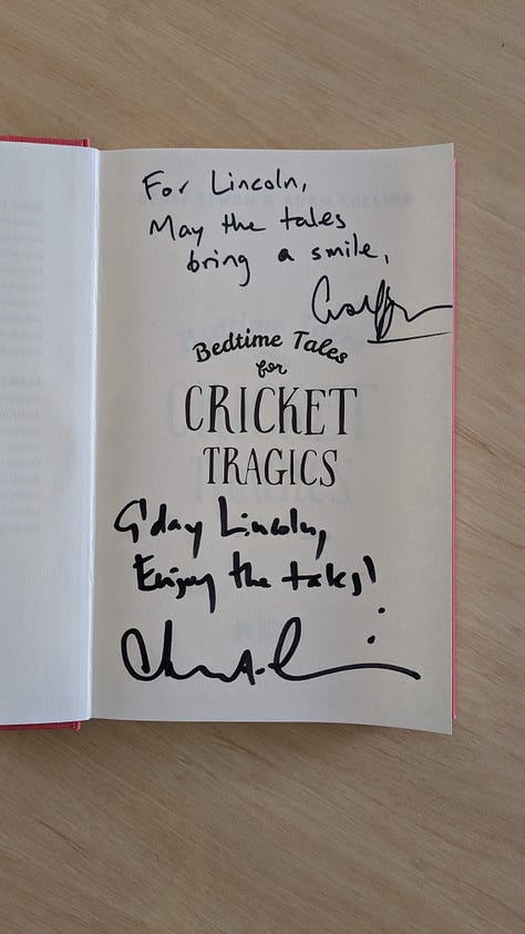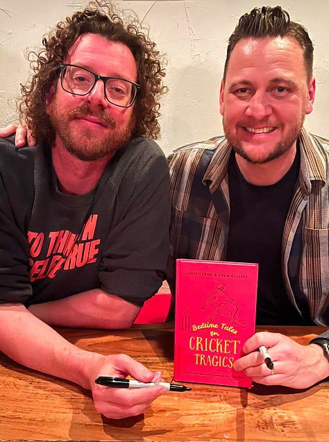Last night I ducked into the Commercial Club Hotel in Fitzroy for the Melbourne launch of Bedtime Tales for Cricket Tragics, the latest offering from Geoff Lemon and Adam Collins – the great minds behind The Final Word podcast. The night started with Geoff reading a chapter about the great Laurie Nash, before he and Adam were joined by William McInnes for a brief conversation about cricket, storytelling, and much more. It was a fantastic chat, and it was great to meet the guys and pick up a signed copy of the book.